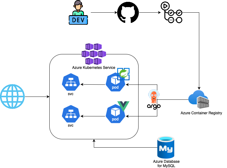 대부분의 CI/CD 파이프라인과 Azure 리소스 자원이 찍힌 상태로 아키텍쳐는 위와 같다. 위 구조로 서비스를 배포하고 서비스에 접속하니 하나의 에러와 마주쳤다.