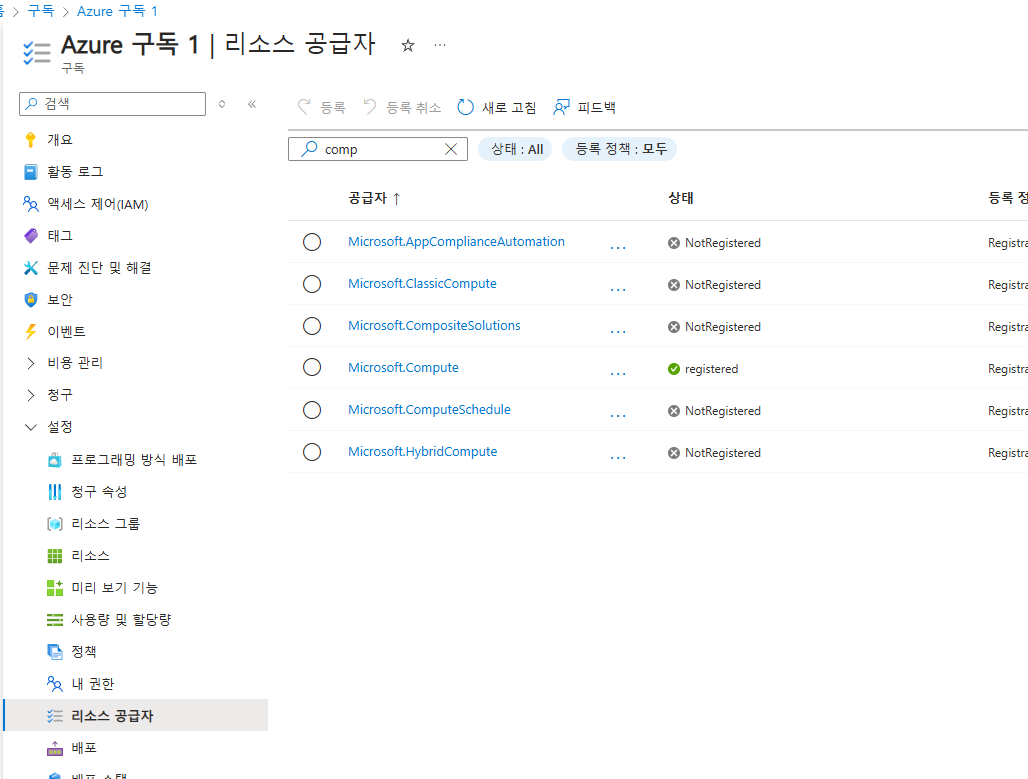 구독 → 설정 → 리소스 공급자