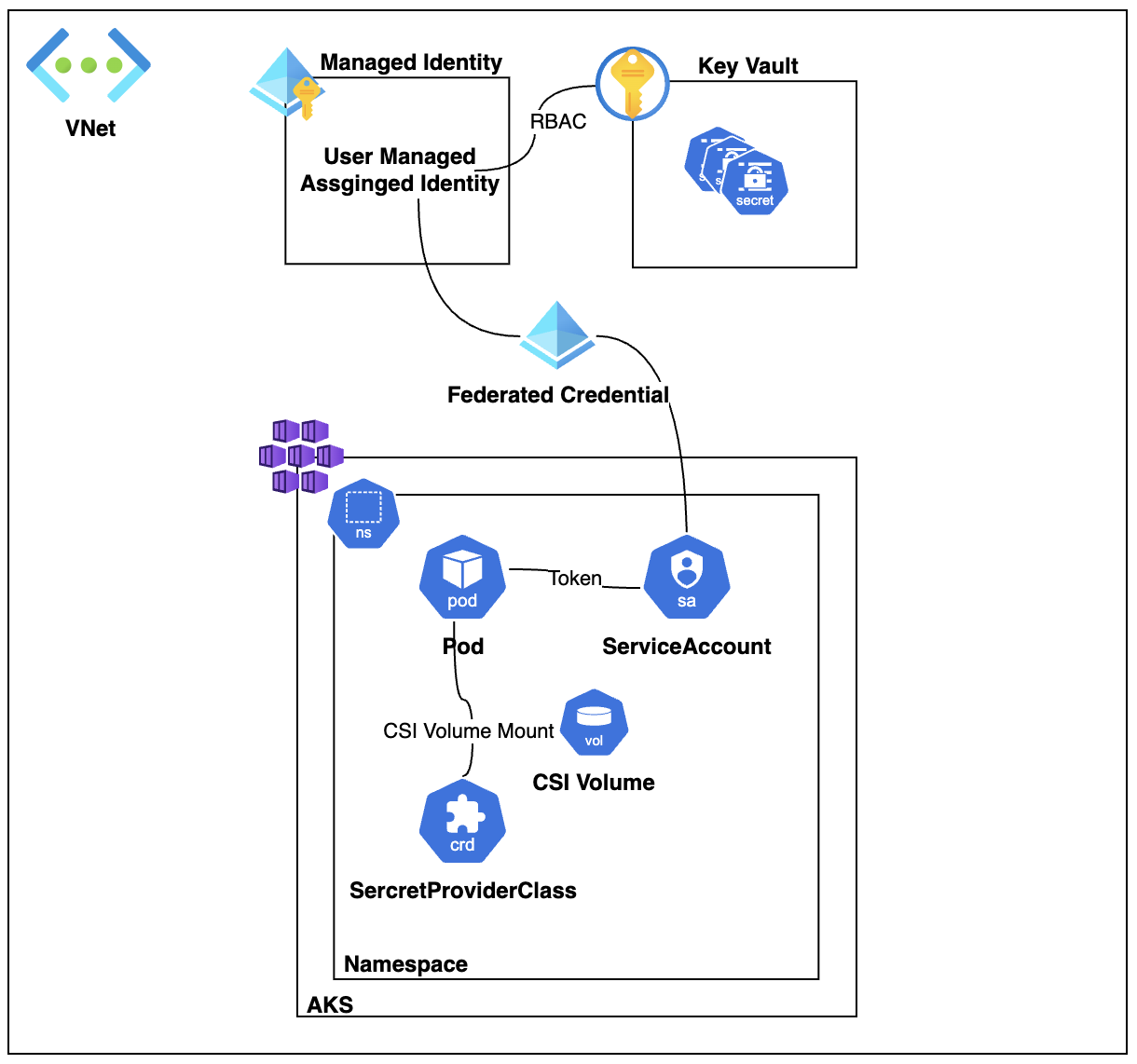 즉 Pod가 직접 Key Vault에 접근하는 것이 아닌, SPC가 중간에서 Key Vault의 API를 호출하고 이를 Pod의 Volume에 저장하여 접근할 수 있게 한다.
