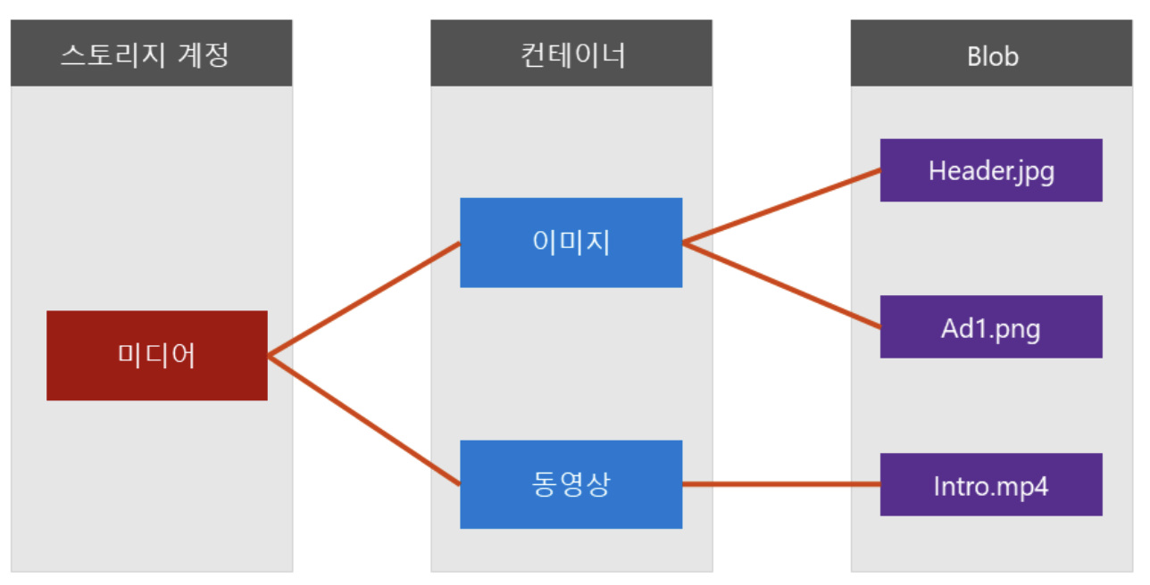 하나의 스토리지 계정에 디렉터리와 비슷한 구조로 Blob을 논리적으로 그룹화한다. 이렇게 그룹화된 blob은 컨테이너의 이름을 일부로 URI가 제작된다.
