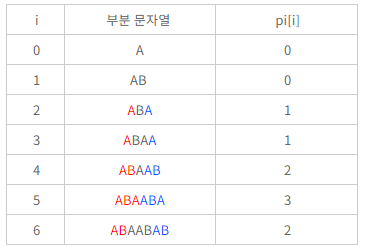 - 패턴을 전 처리하여 부분 일치 테이블 배열 pi[k]를 구해서 잘못된 시작을 최소화함